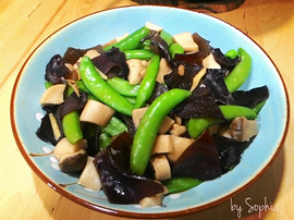 - 準備一平底鍋,以橄欖油稍微熱鍋後,加入蒜頭、薑末及黑木耳、杏鮑菇後,加入少許水,再蓋上鍋蓋,待七八分熟後,最後下甜豆,起鍋前加入適當的調味料即可上桌。